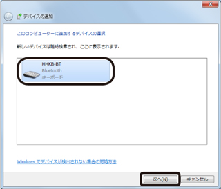 - パソコンの「コントロール パネル」画面から「デバイスの追加」をクリック、表示されているProfessional BTの名称 HHKB-BT を選択、表示されたペアリング用数桁の数字コードを入力